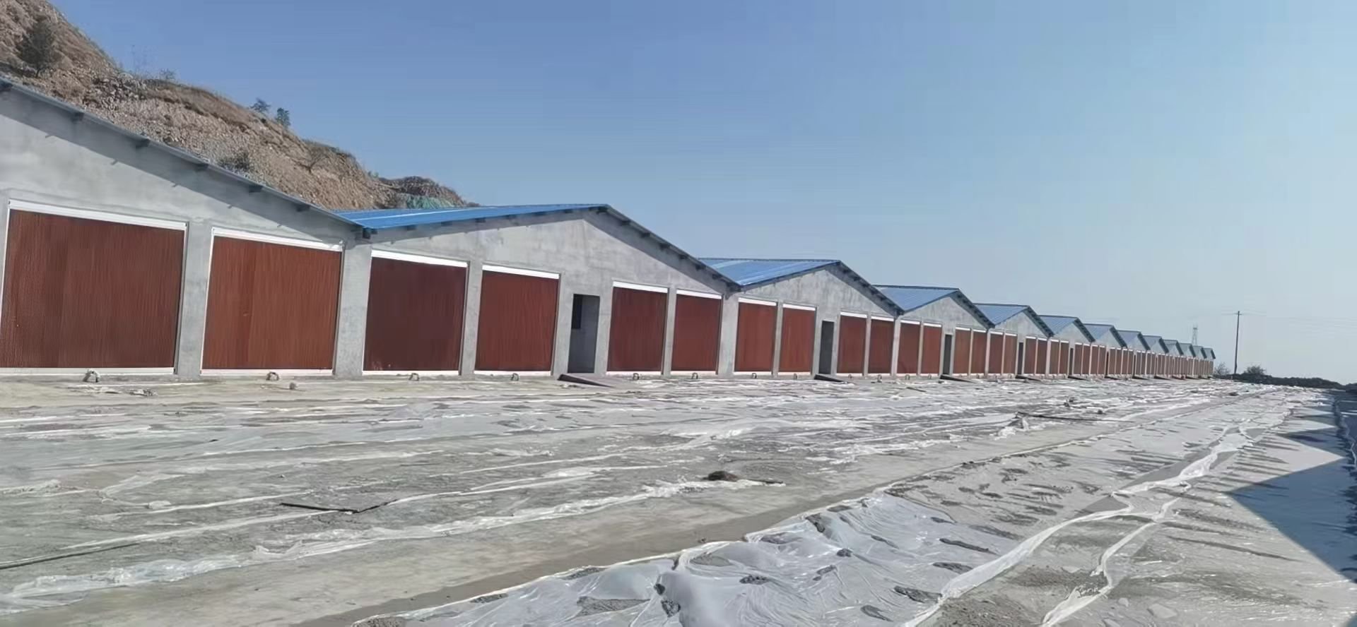 Проект учитывает особенности планировки крупных животноводческих комплексов, расположенных вблизи горных районов, с размещением охлаждающих площадок на аккуратно расположенных внешних стенах животноводческих помещений. Здания отличаются единым архитектурным стилем: прочные цементные стены дополнены коричнево-красными рольставнями и синими крышами, которые ярко выделяются на солнце, обеспечивая стабильную основу для установки системы охлаждающих площадок.